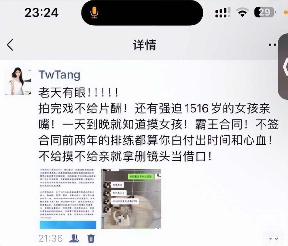其中有一位当时深受其害的演员,在pyq为曾经的自己勇敢发声,她称自己十四五岁时就被郑某峰“亲亲抱抱”过,与她一同在剧组的演员们,都没能逃过魔爪。